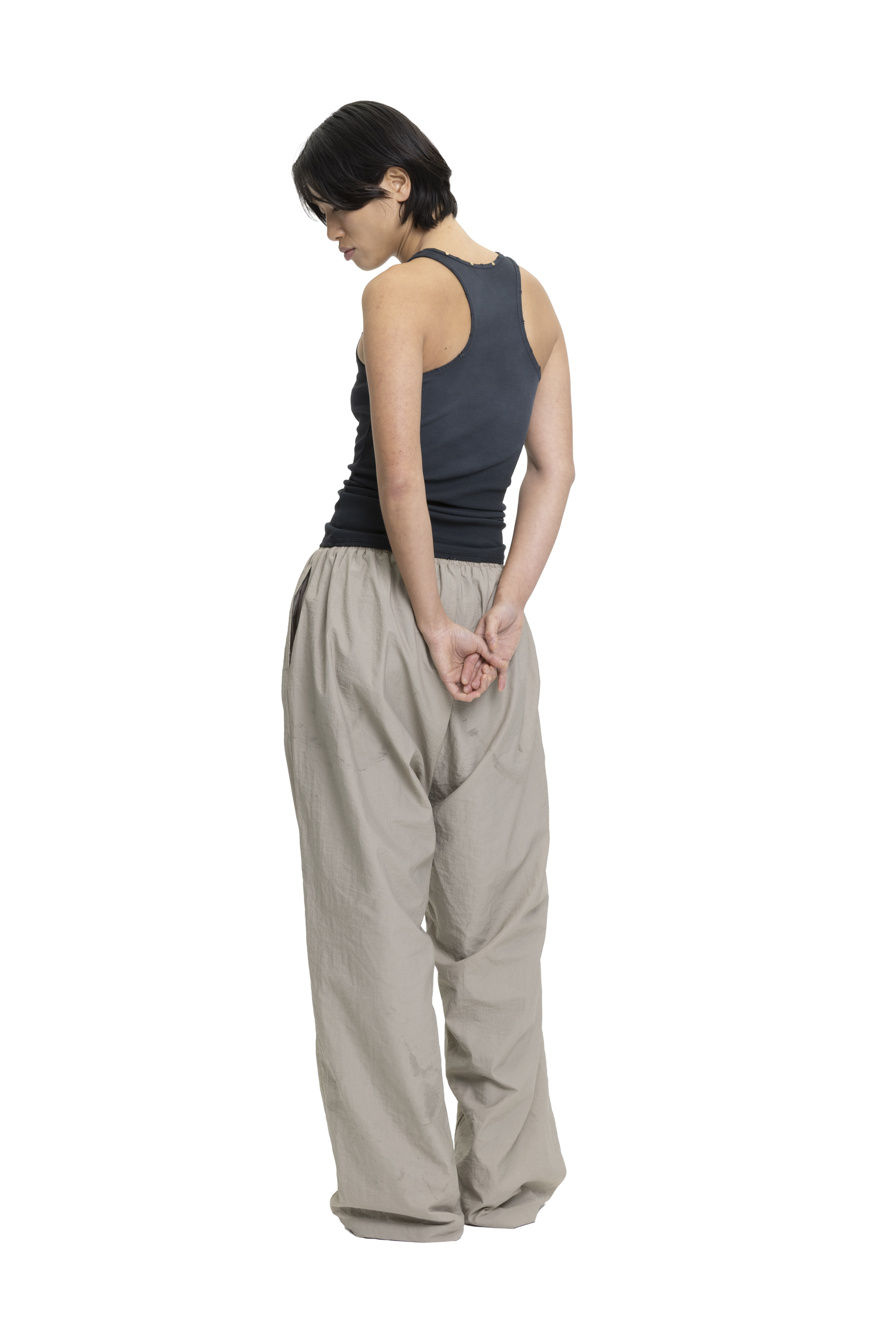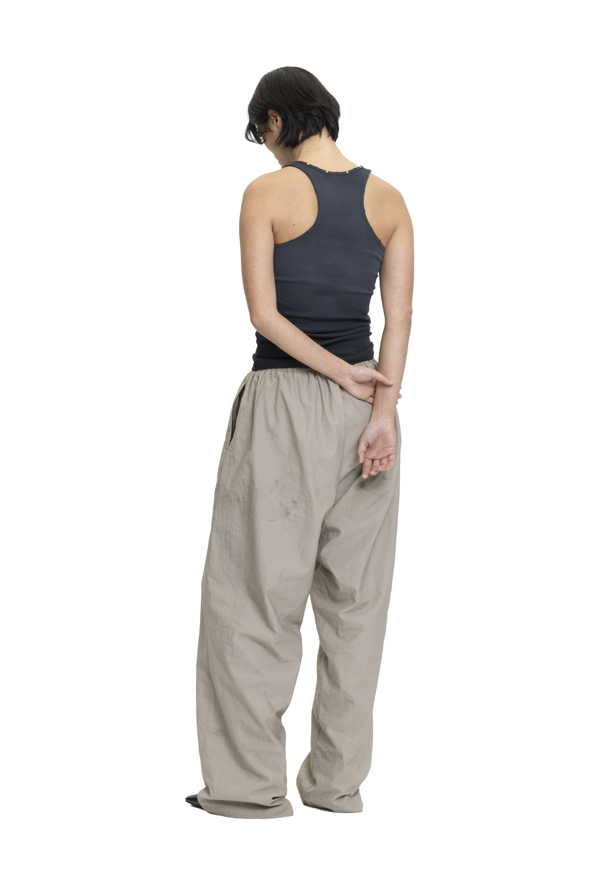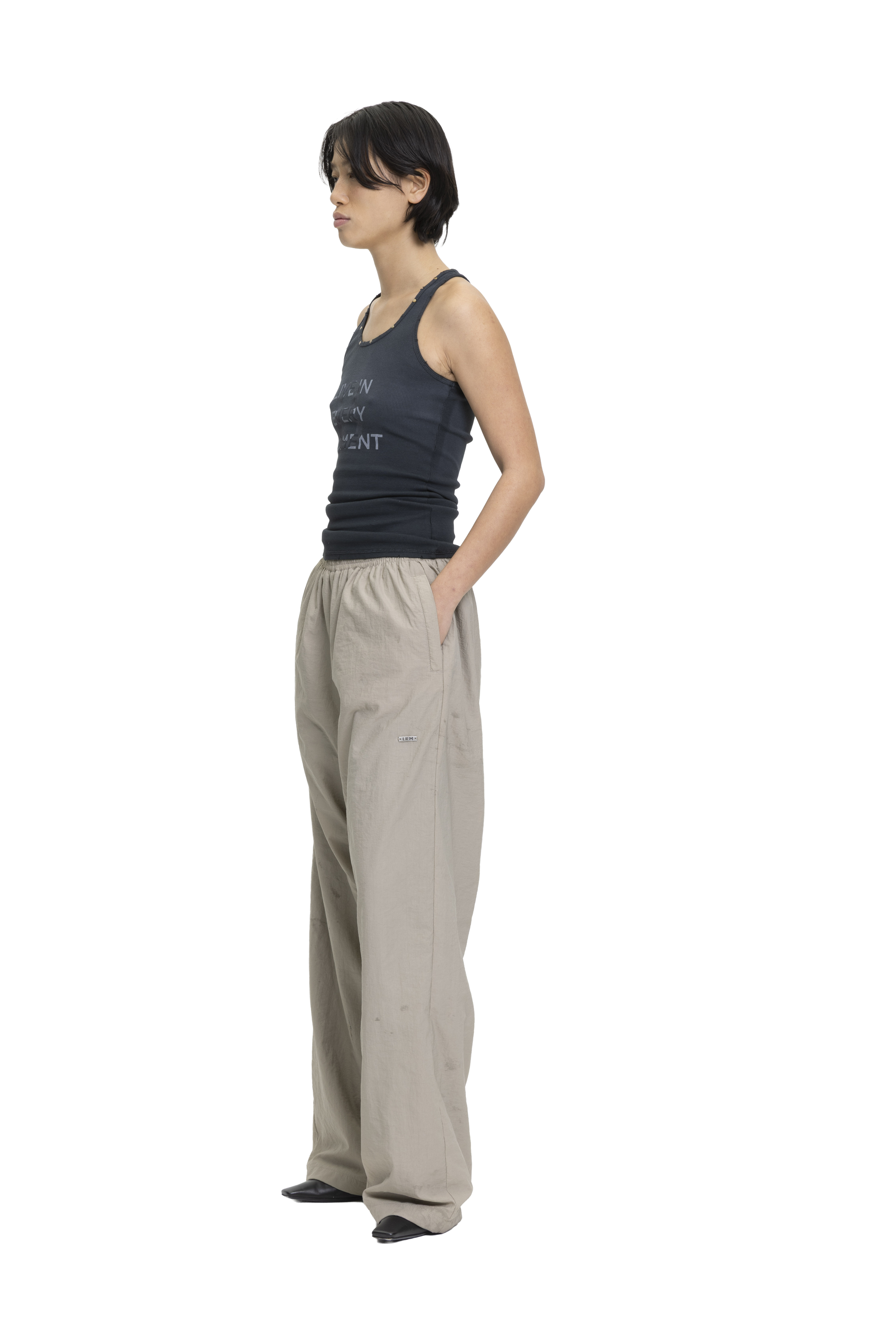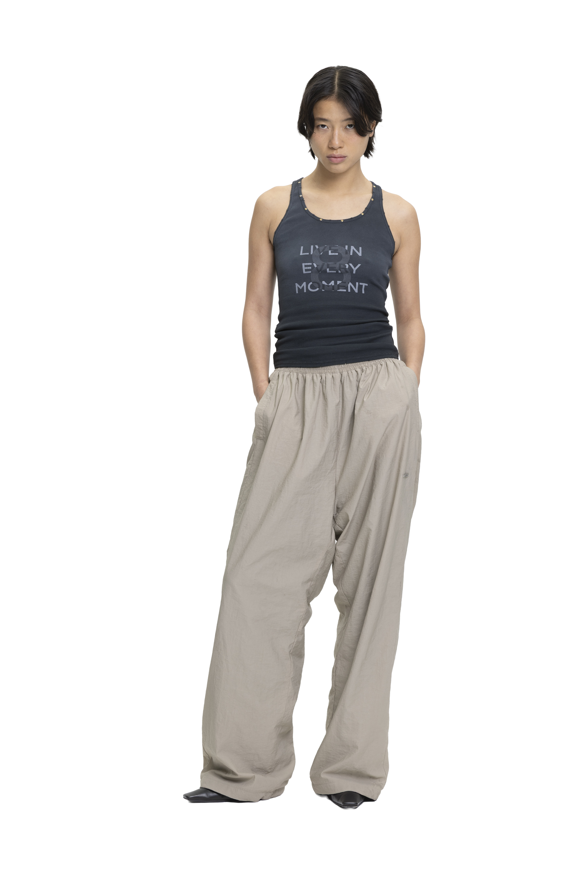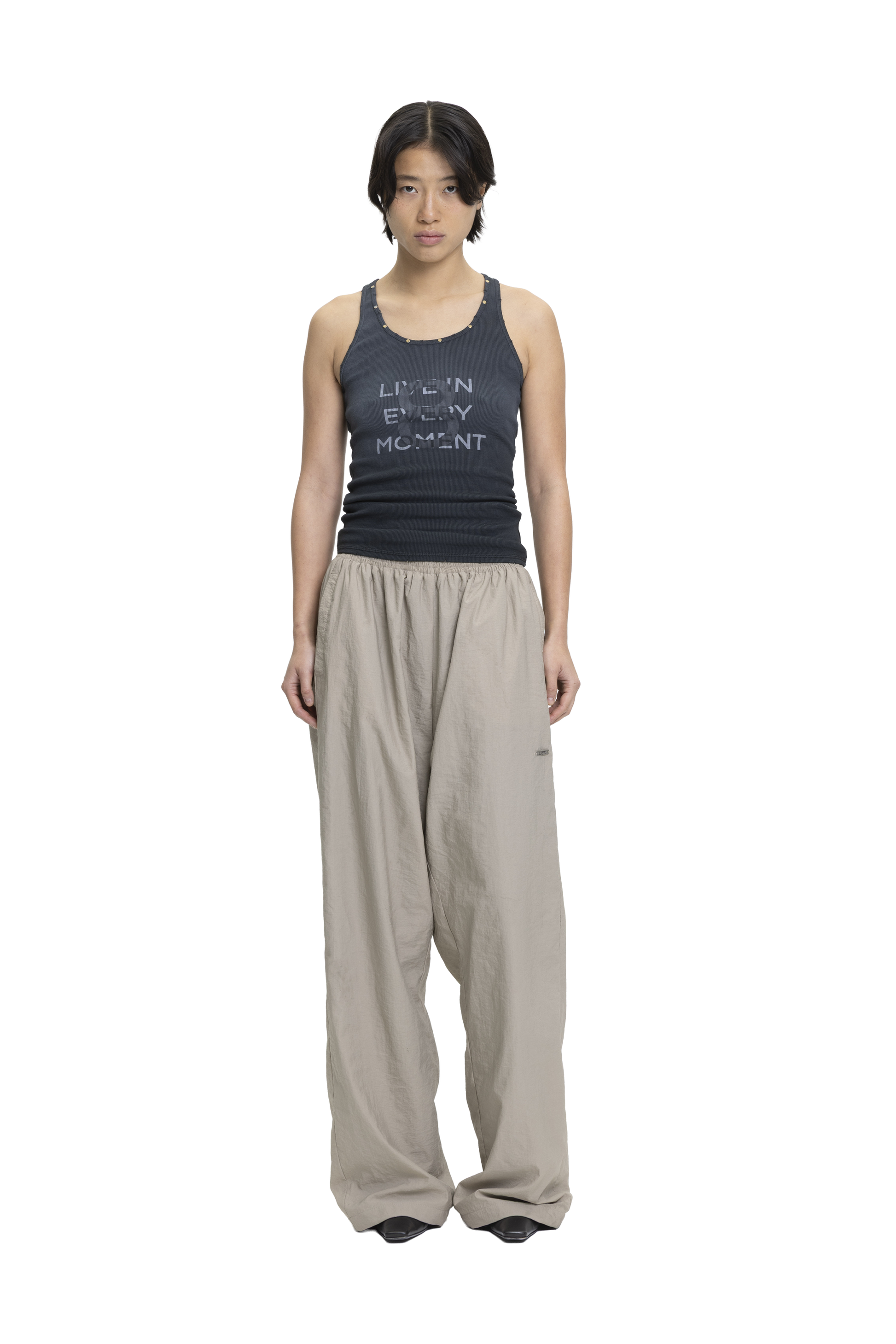Cotton rib tank top with added stretch, designed to fit the body closely. Features a front screen-printed graphic with rivet detailing along the neckline. Finished with a stone wash and vintage-effect spray for a worn-in look.