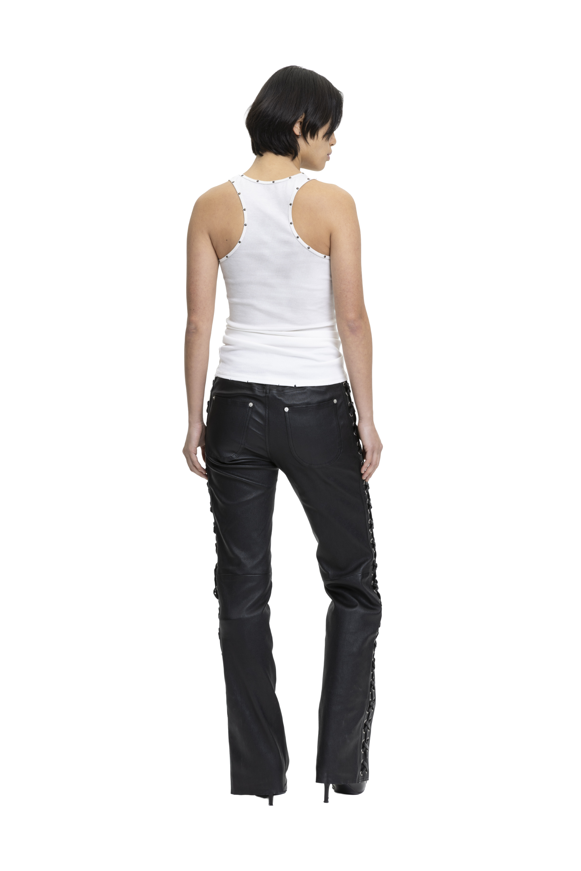 Cotton rib tank top with added stretch, designed to fit the body closely. Features a front screen-printed graphic with rivet detailing along the neckline. Finished with a stone wash and vintage-effect spray for a worn-in look.