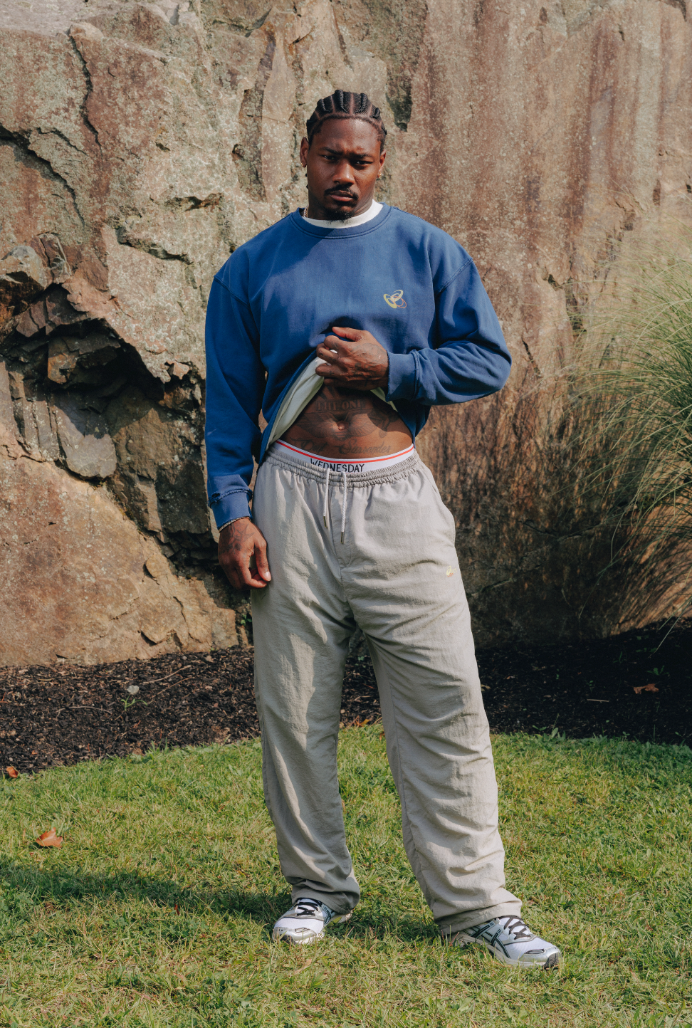 Standard fit track pant, elastic waistband, constructed from nylon, screen printed exclusive Asics x Liem logo