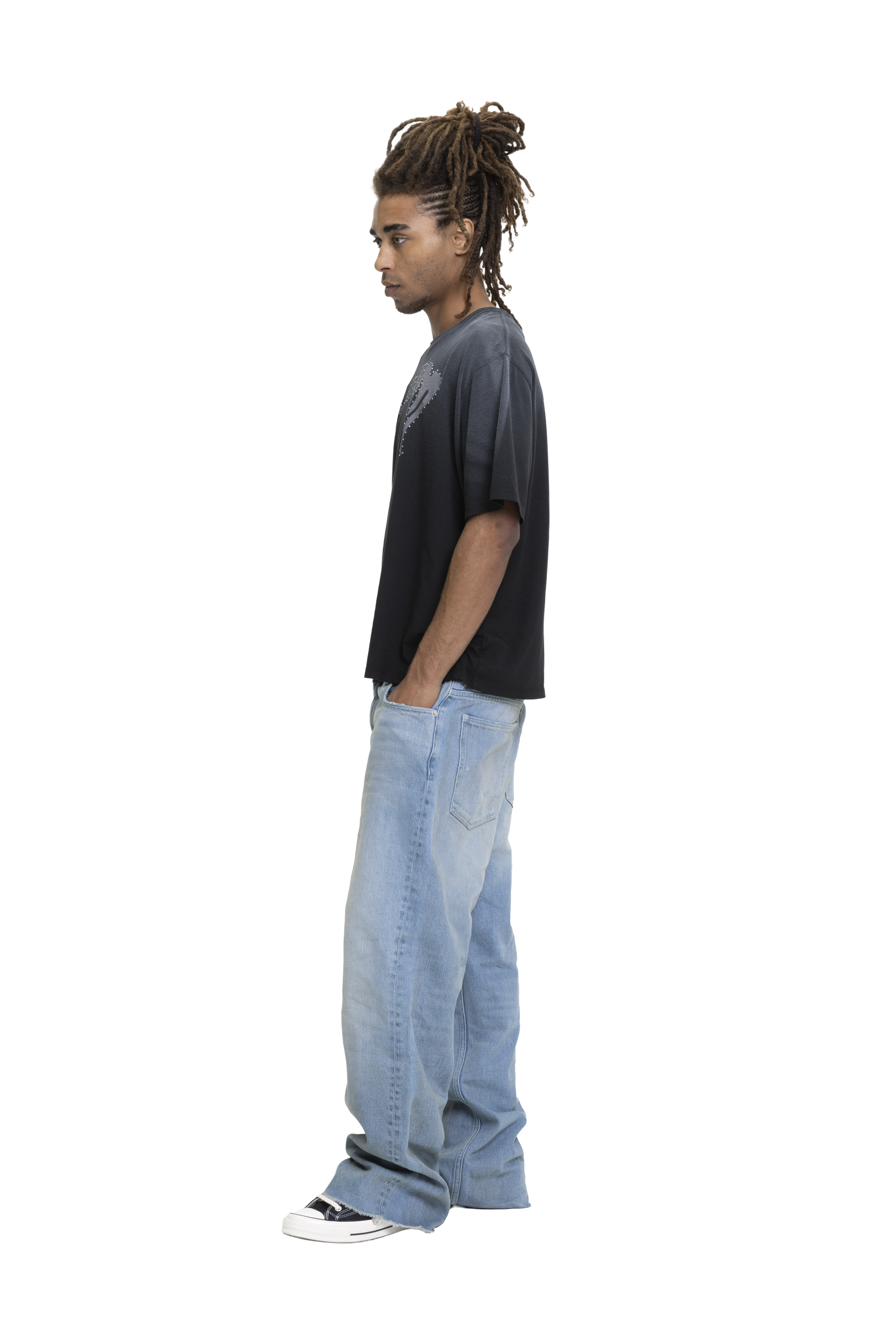 Regular-fit T-shirt crafted from high-quality brushed cotton with integrated modal. Features a LIEM front graphic applied as a screen print with rhinestones around it. Finished with a stone wash, subtle hand distressing, and a vintage-effect spray for a naturally worn look.